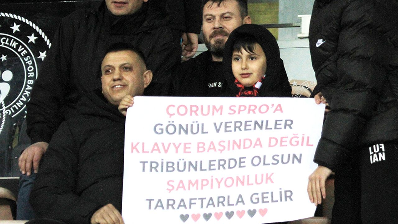Soğuk ve yağışlı havaya aldırış etmeden tribüne gelerek maçı ailesi ile takip eden minik bir taraftar “Çorumspor’a gönül verenler klavye başında değil tribünlerde olsun. Şampiyonluk taraftarla gelir” yazılı pankart açtı. Minik taraftarın açtığı bu pankart o bölümde maçı takip eden taraftarlardan büyük alkış aldı.